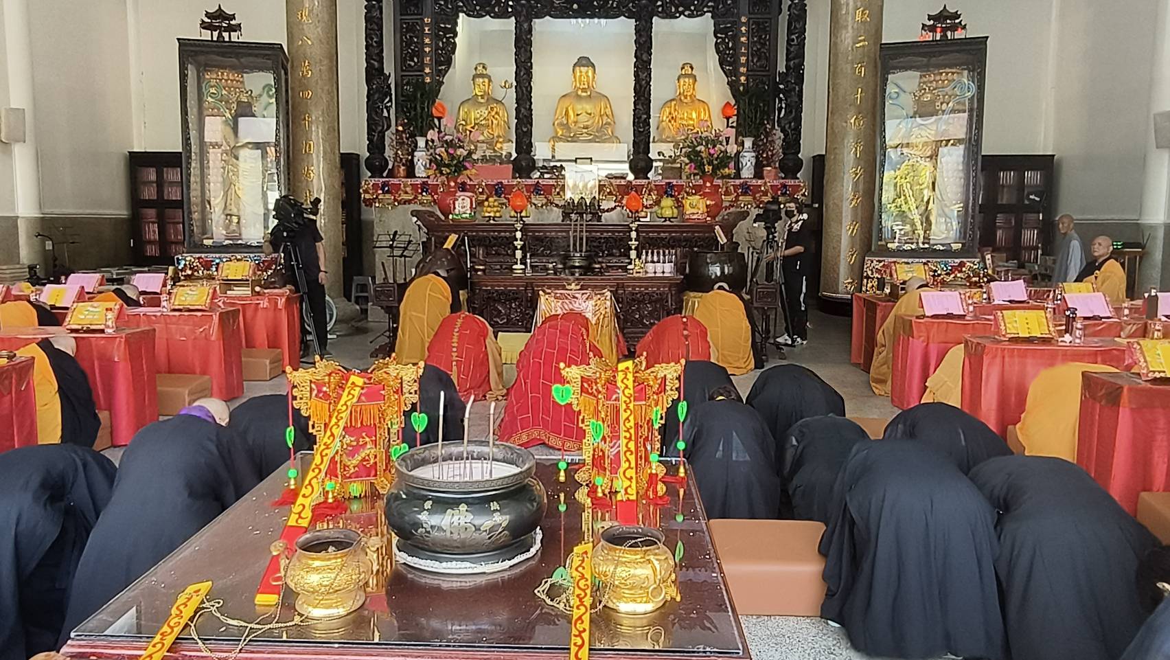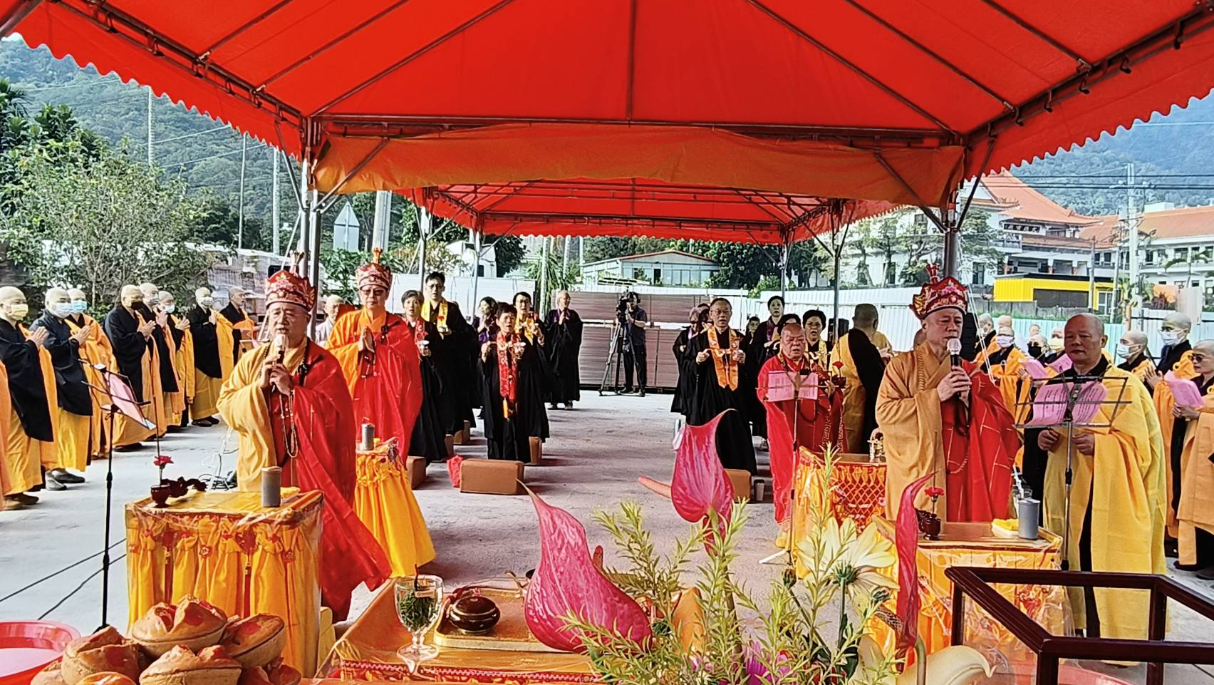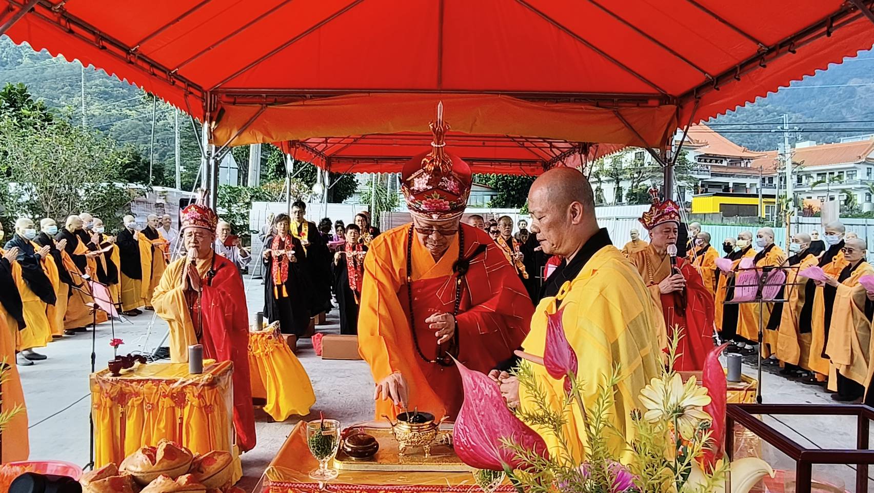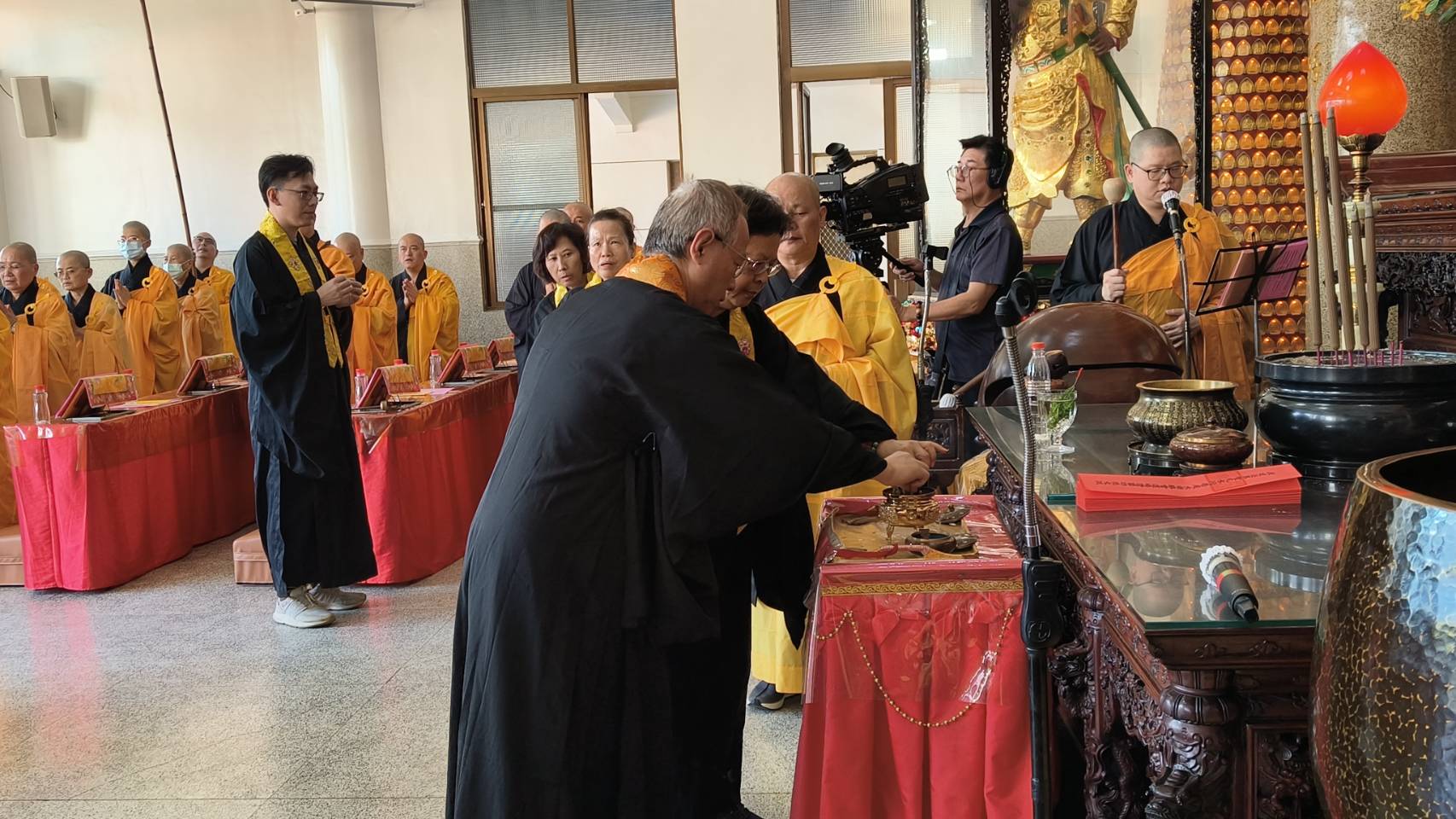 主法和尚宣:「啟建法界聖凡水陸普度大齋勝會道場證盟功德文疏」。宣疏時齋主出班拈香。