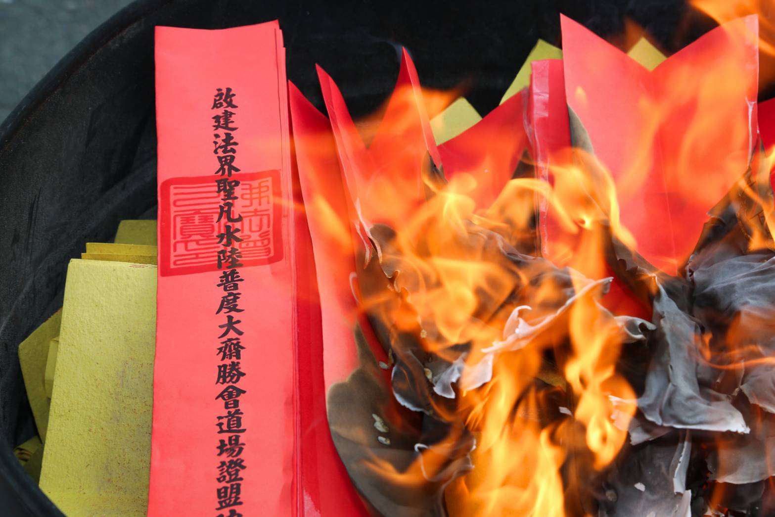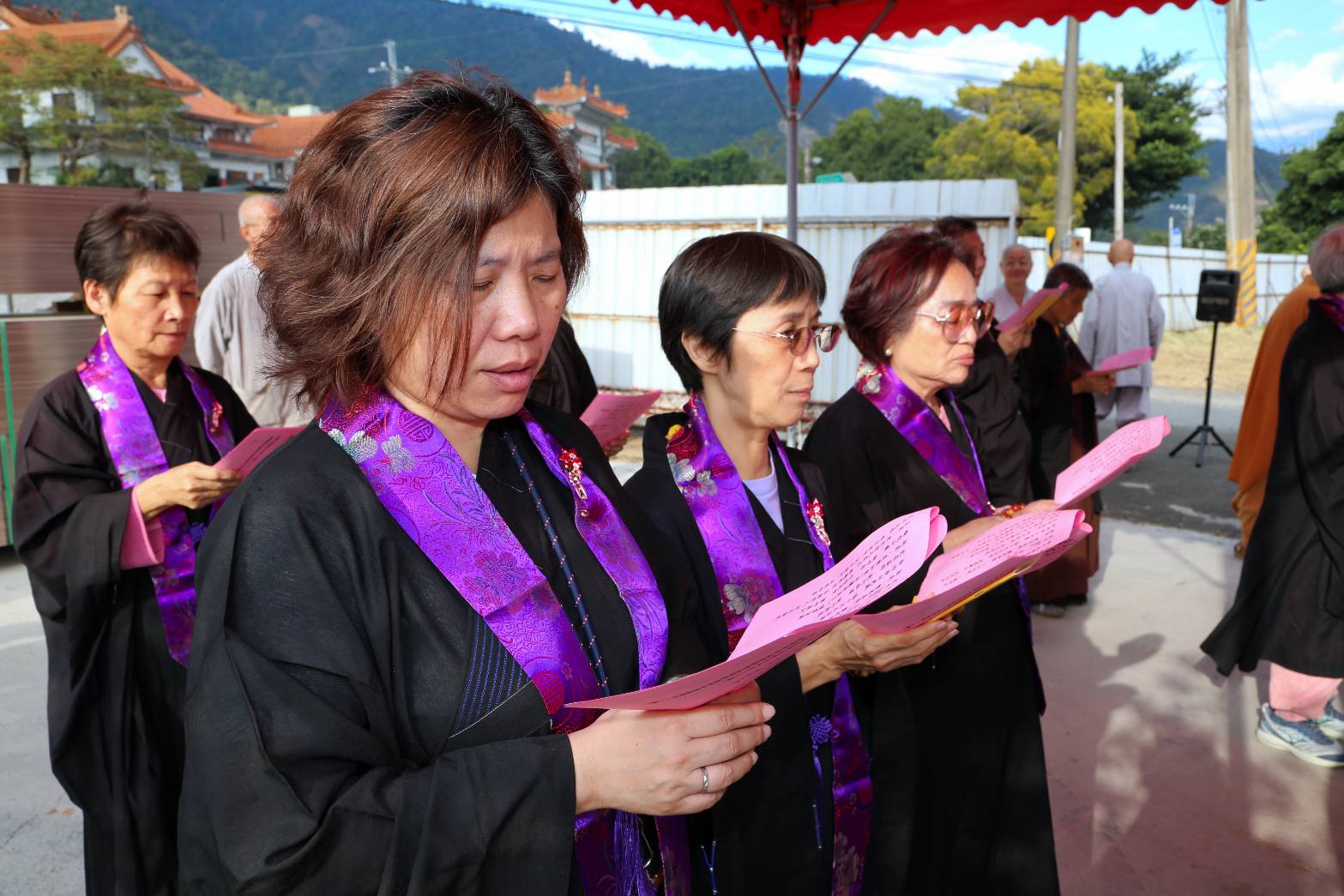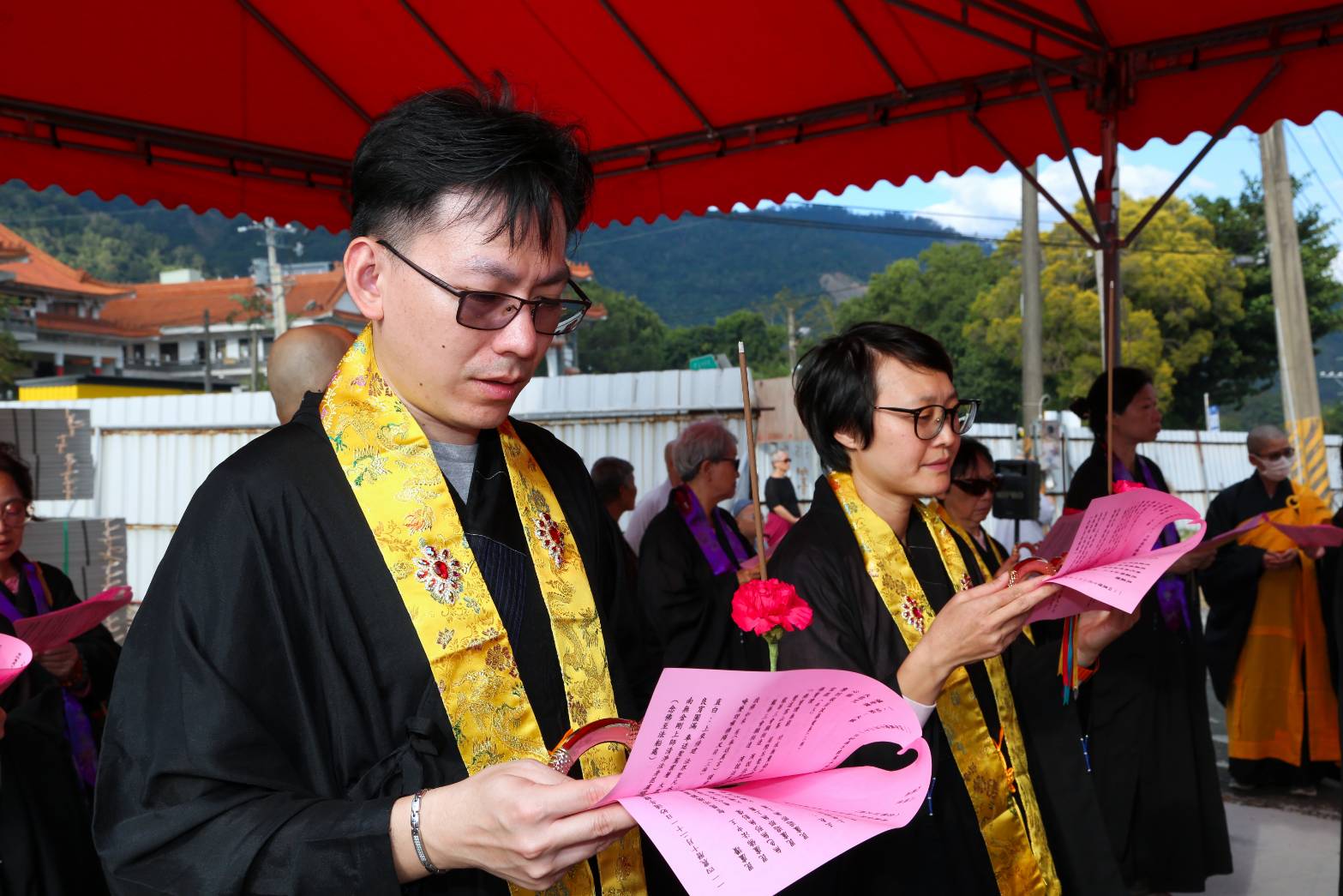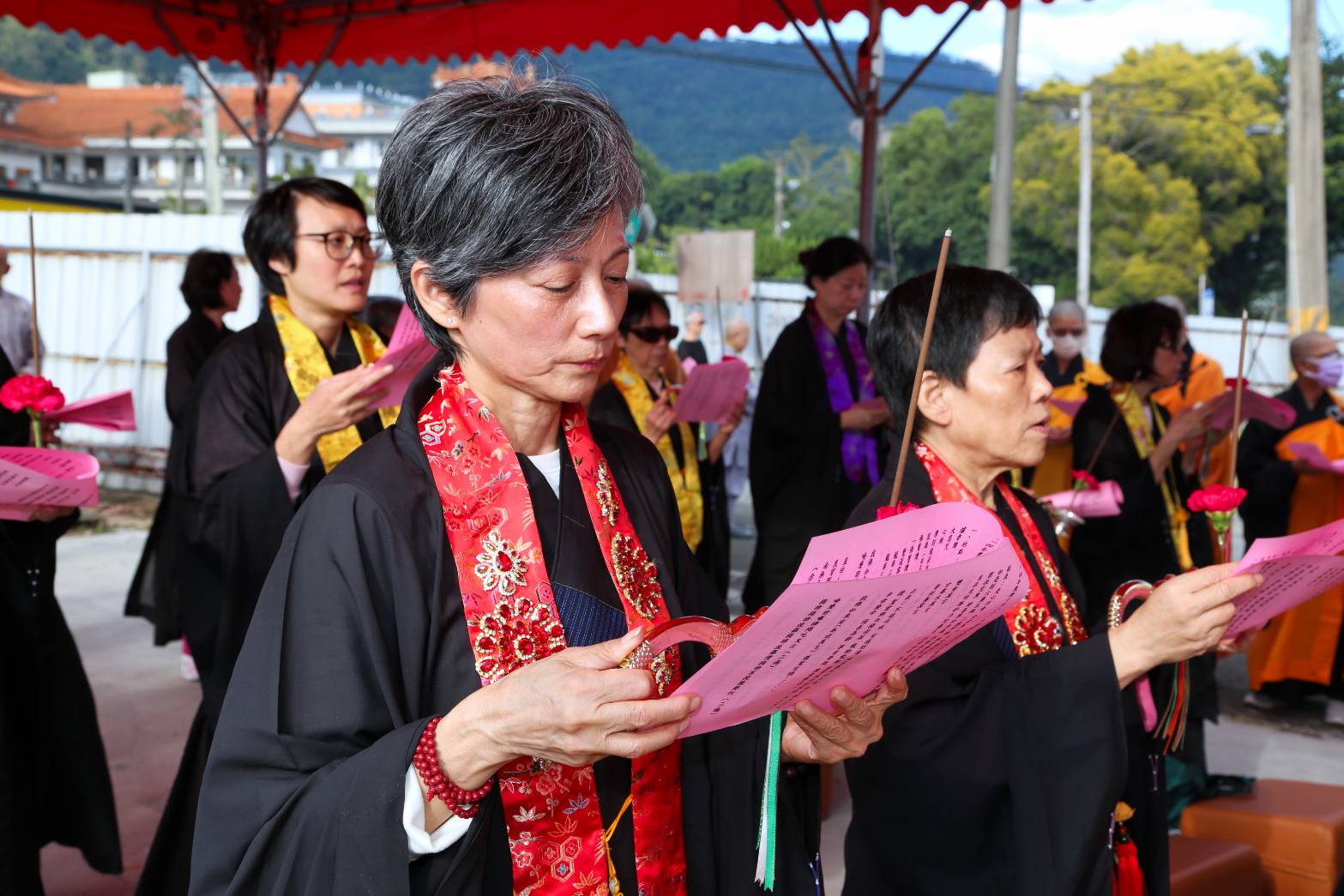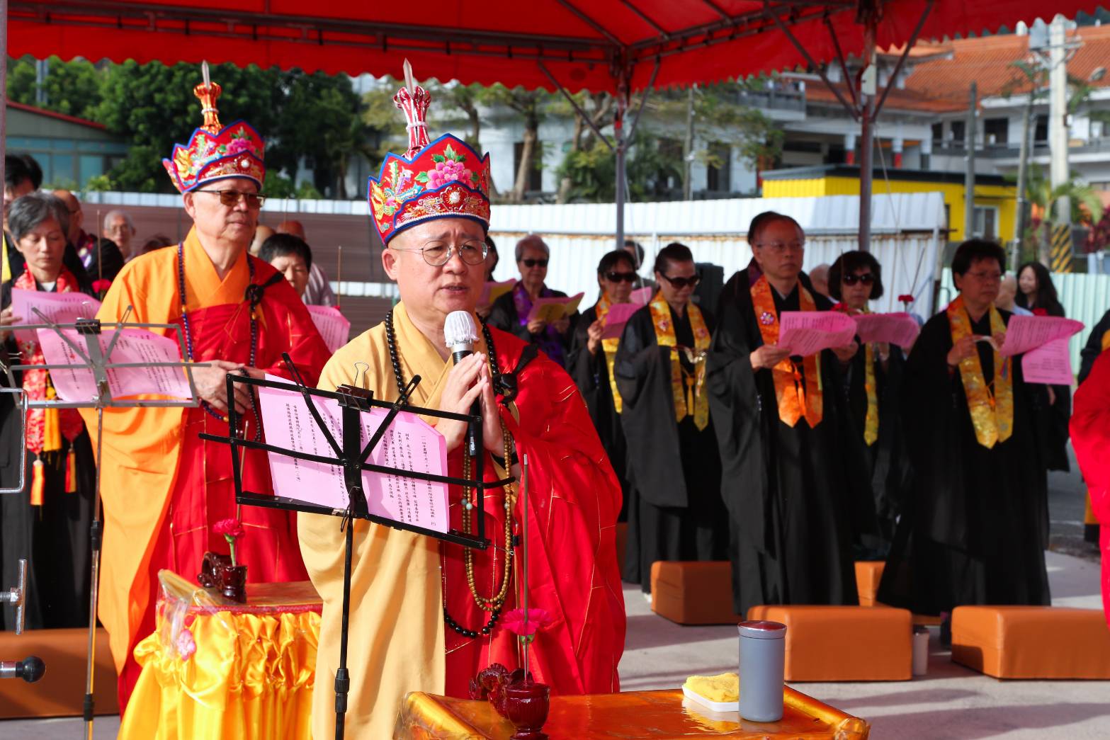 主法和尚宣:「啟建法界聖凡水陸普度大齋勝會道場證盟功德文疏」。宣疏時齋主出班拈香。