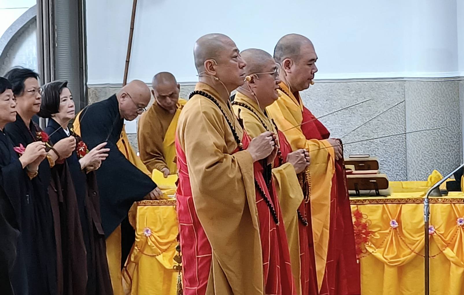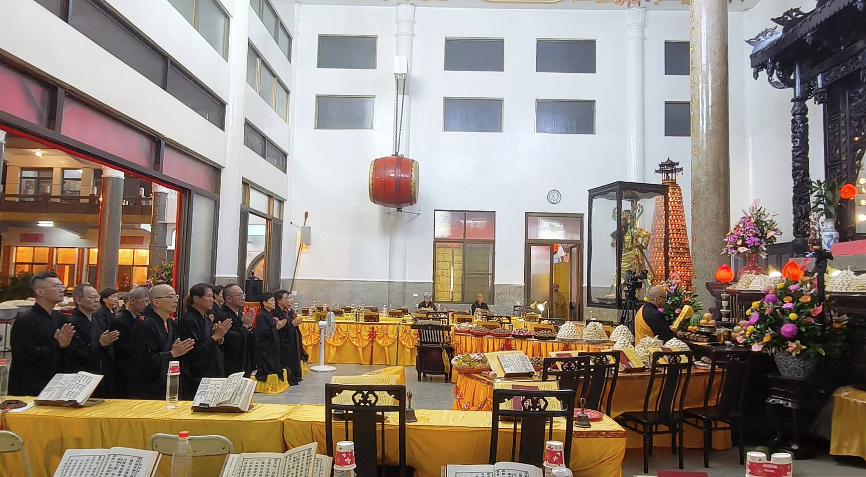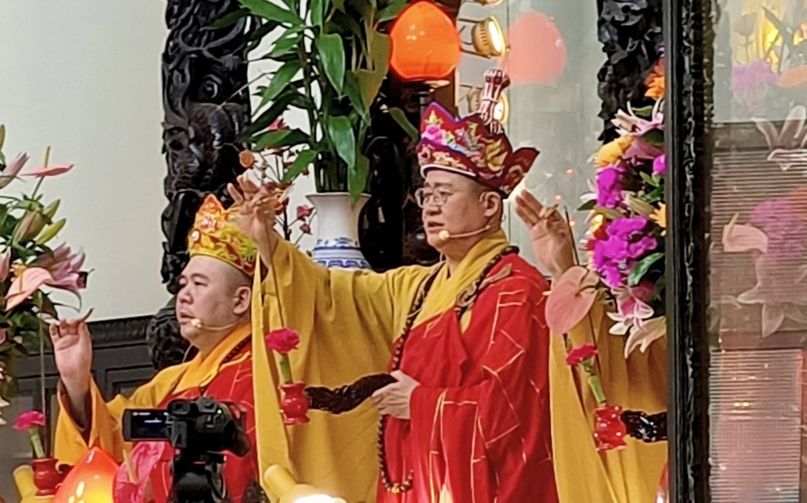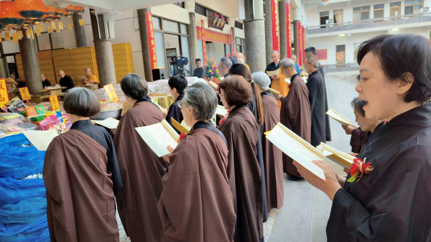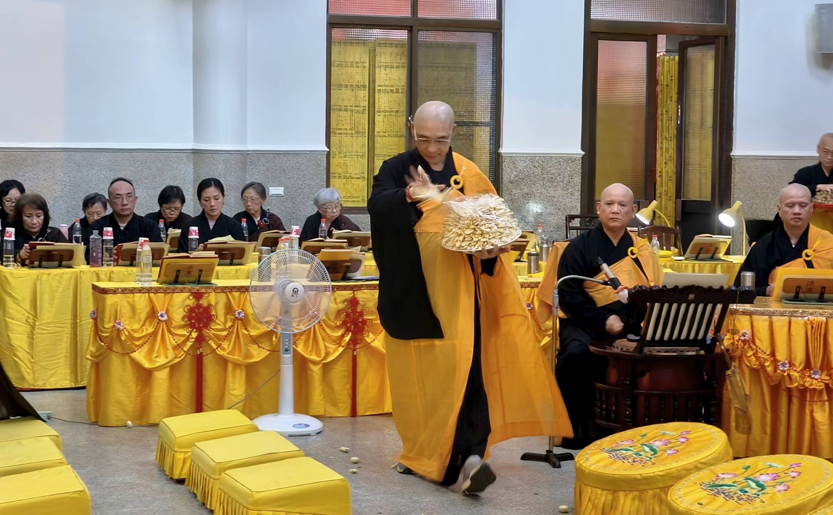 法師宣:「啟建法界聖凡水陸普度大齋勝會道場證盟功德文疏」。齋主專心聆聽金剛上師宣疏。