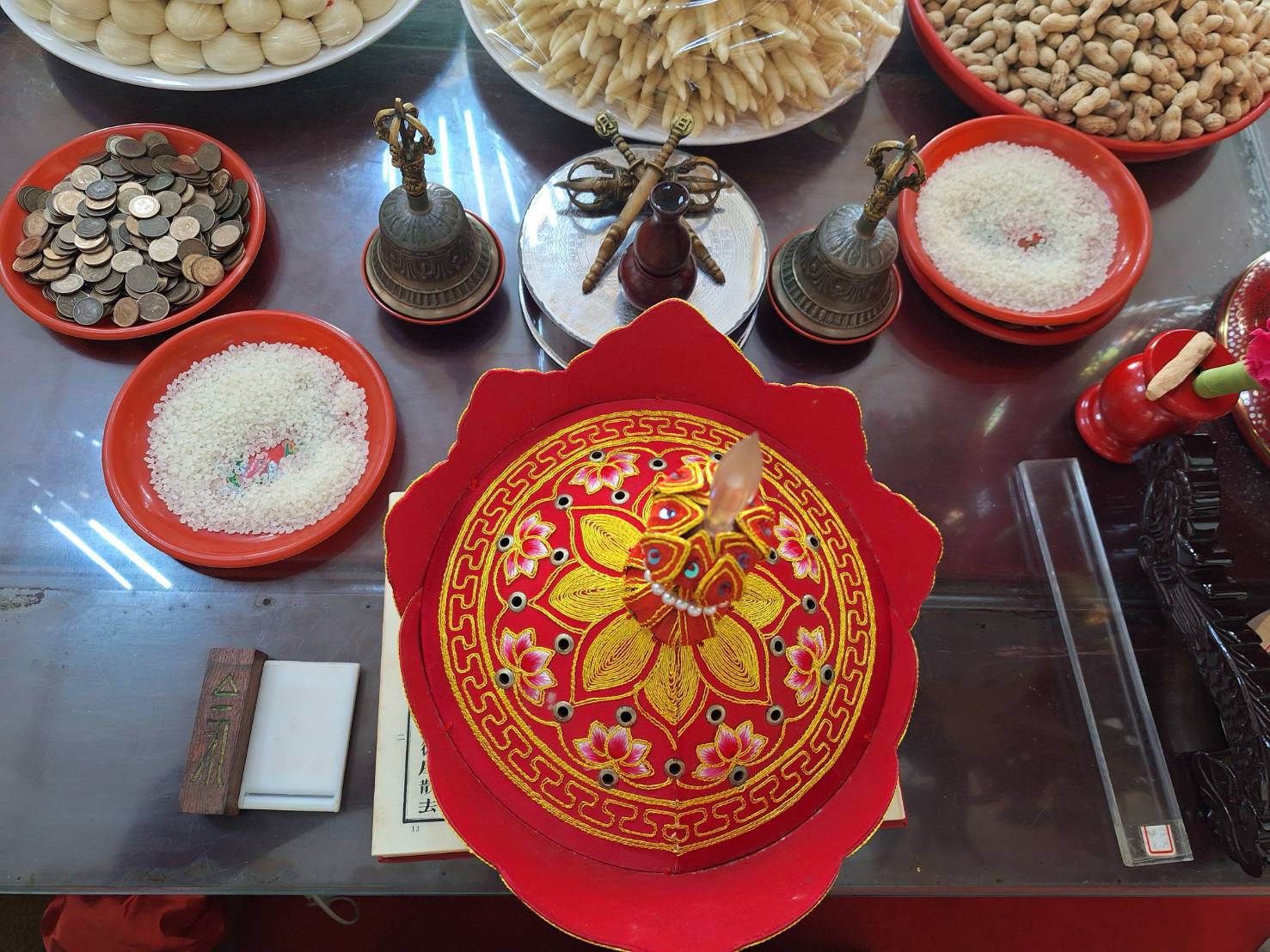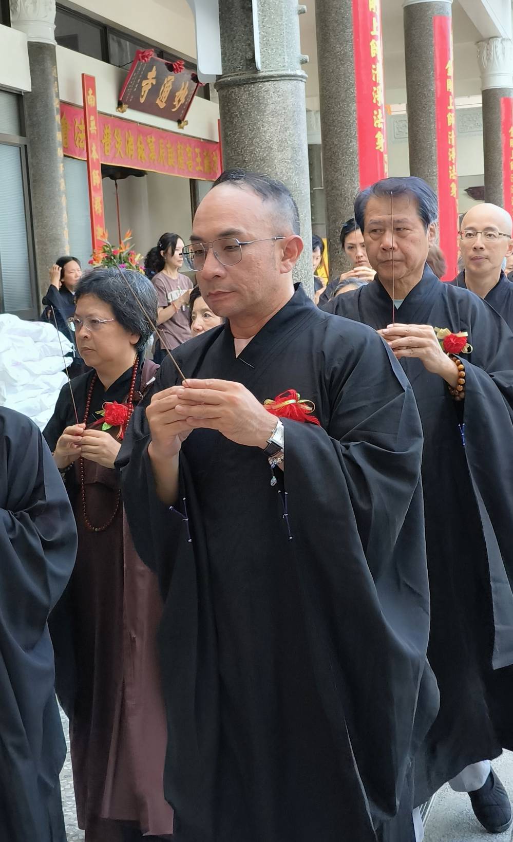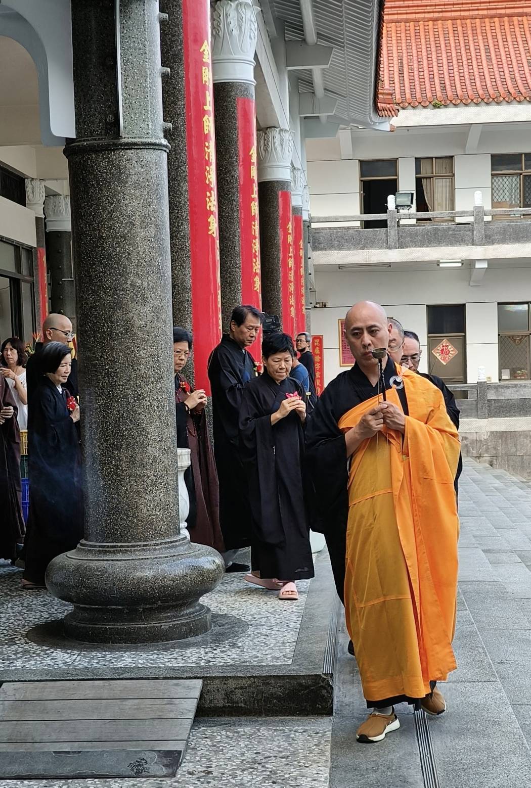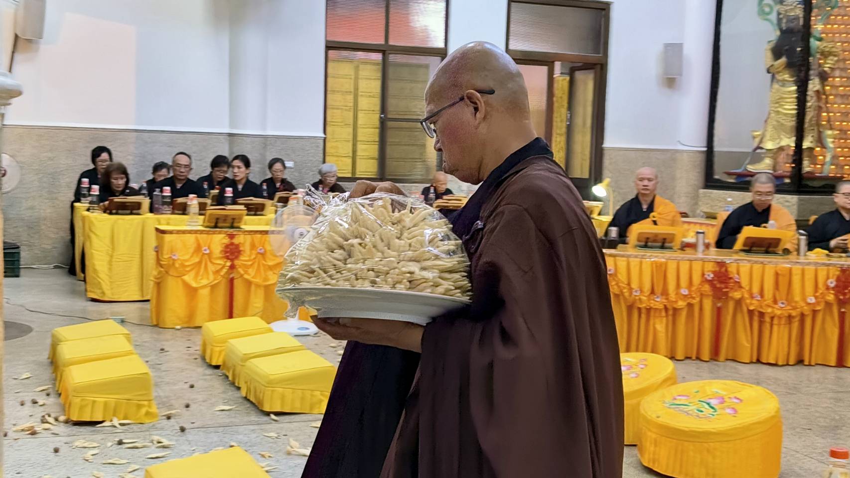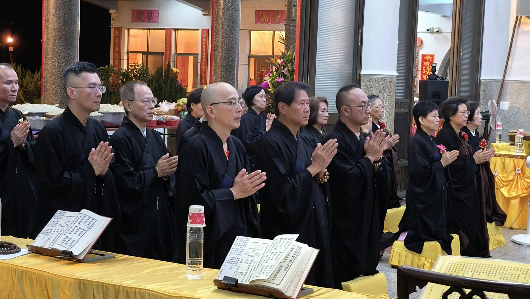 法師宣:「啟建法界聖凡水陸普度大齋勝會道場證盟功德文疏」。齋主專心聆聽金剛上師宣疏。