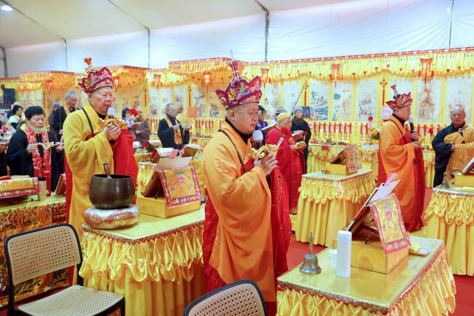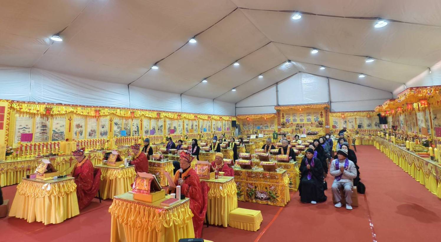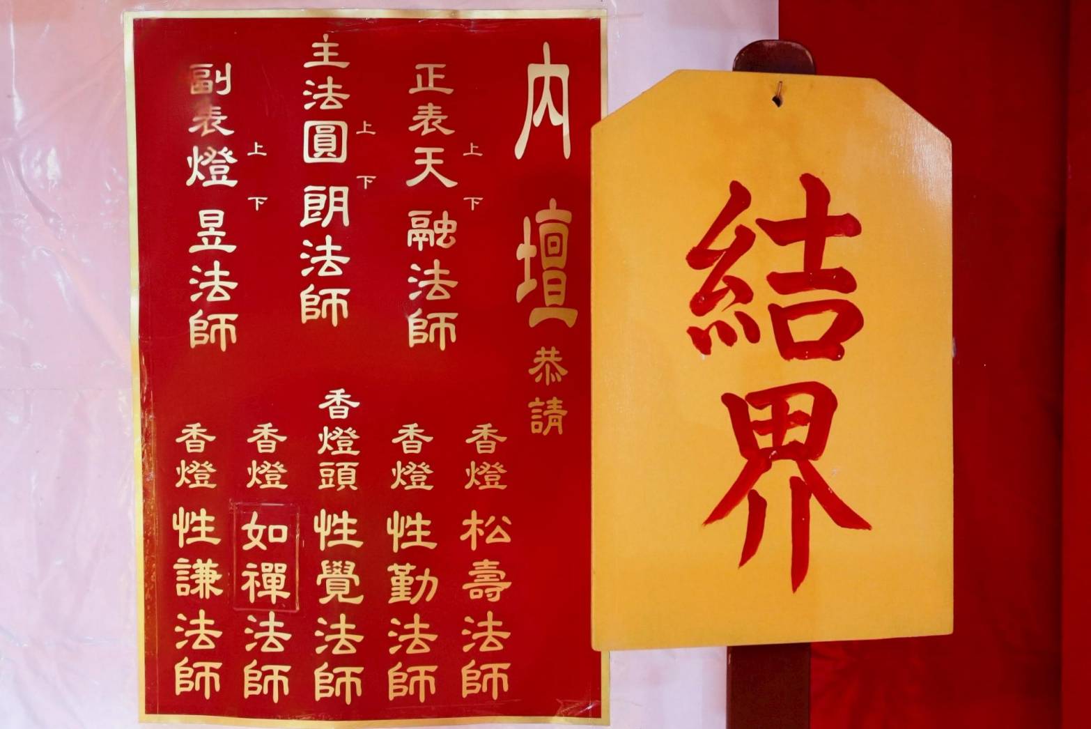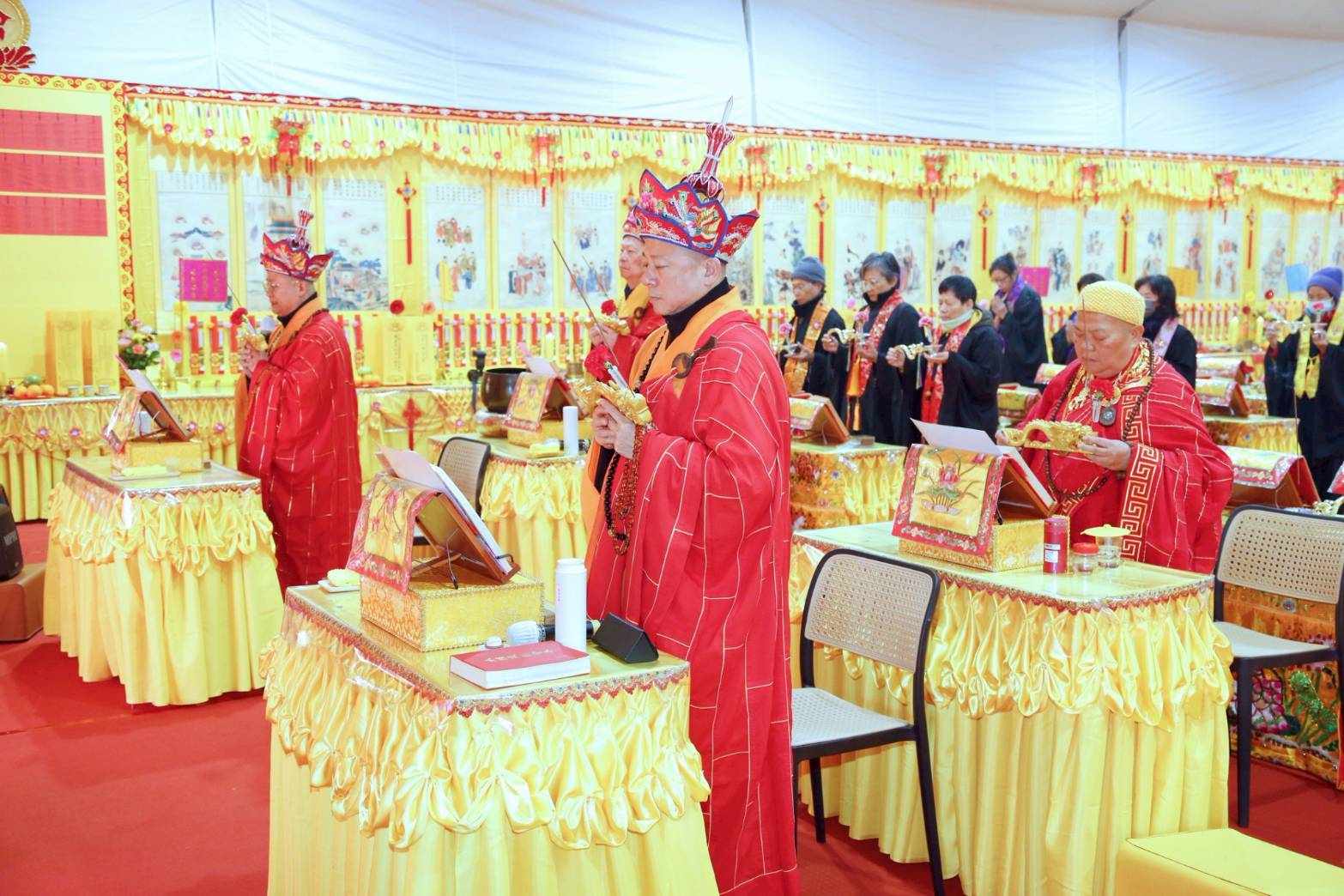 壇內香燈將法師桌椅、科儀、法器及齋主的科儀和拜墊,均向內安置。