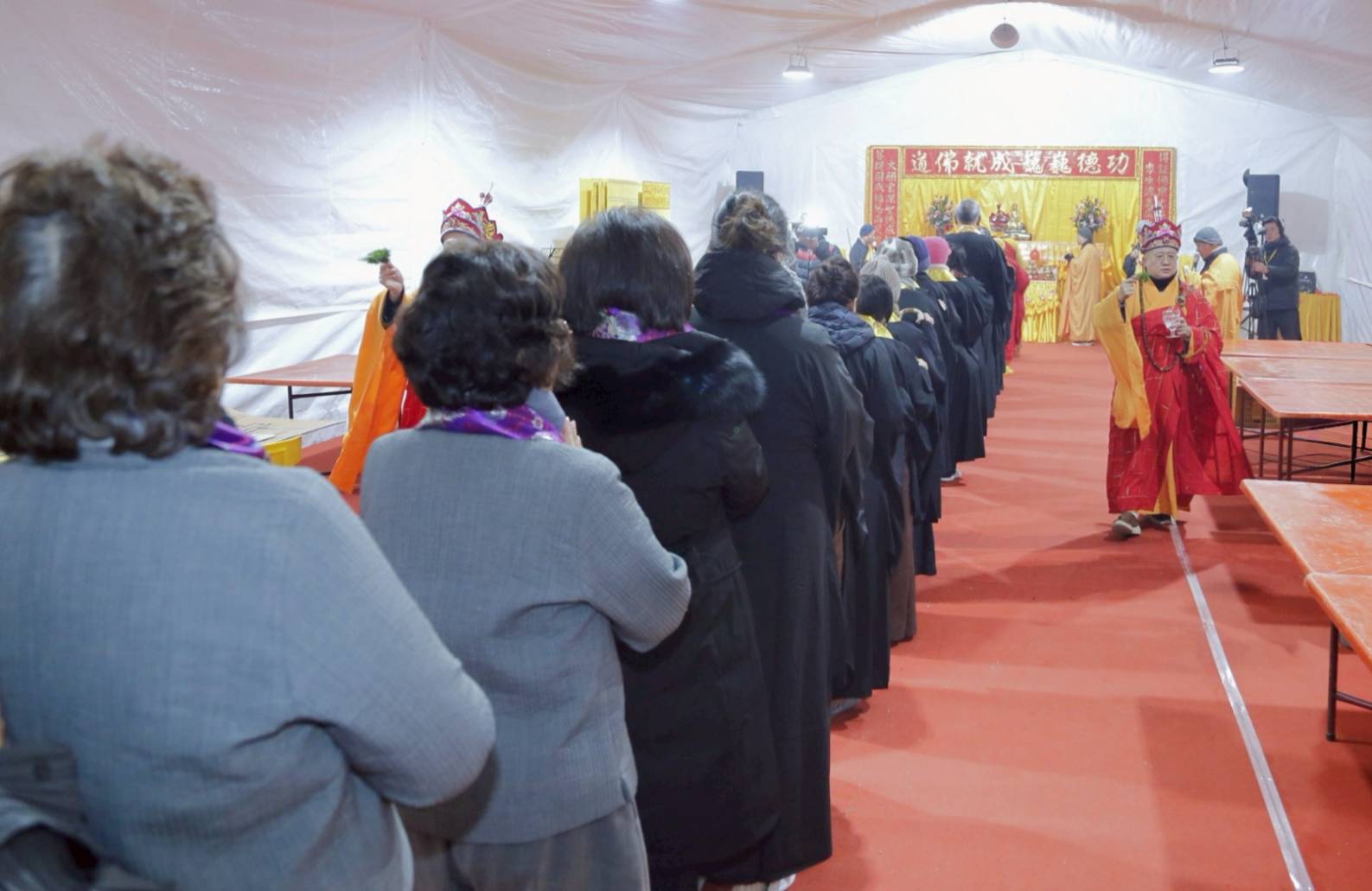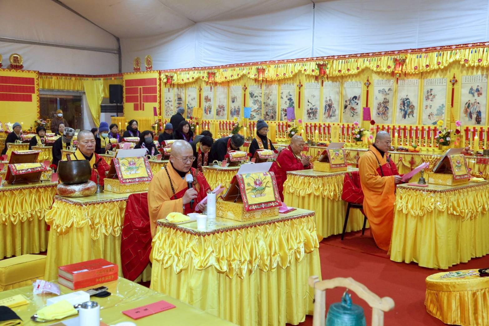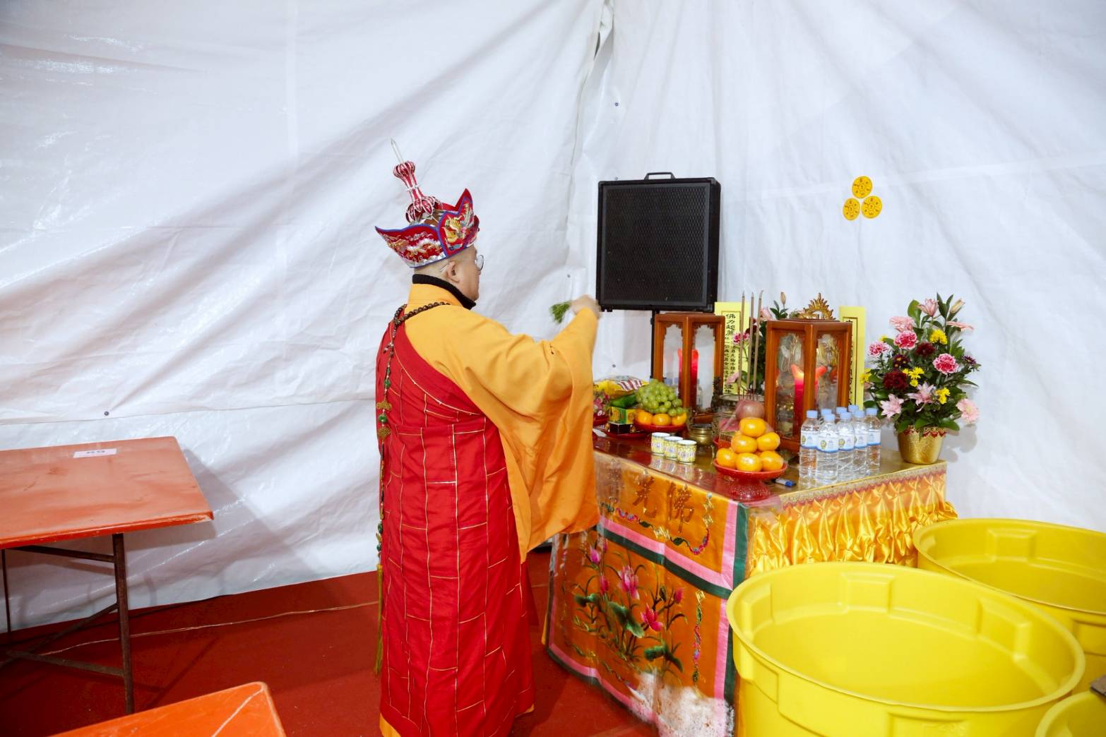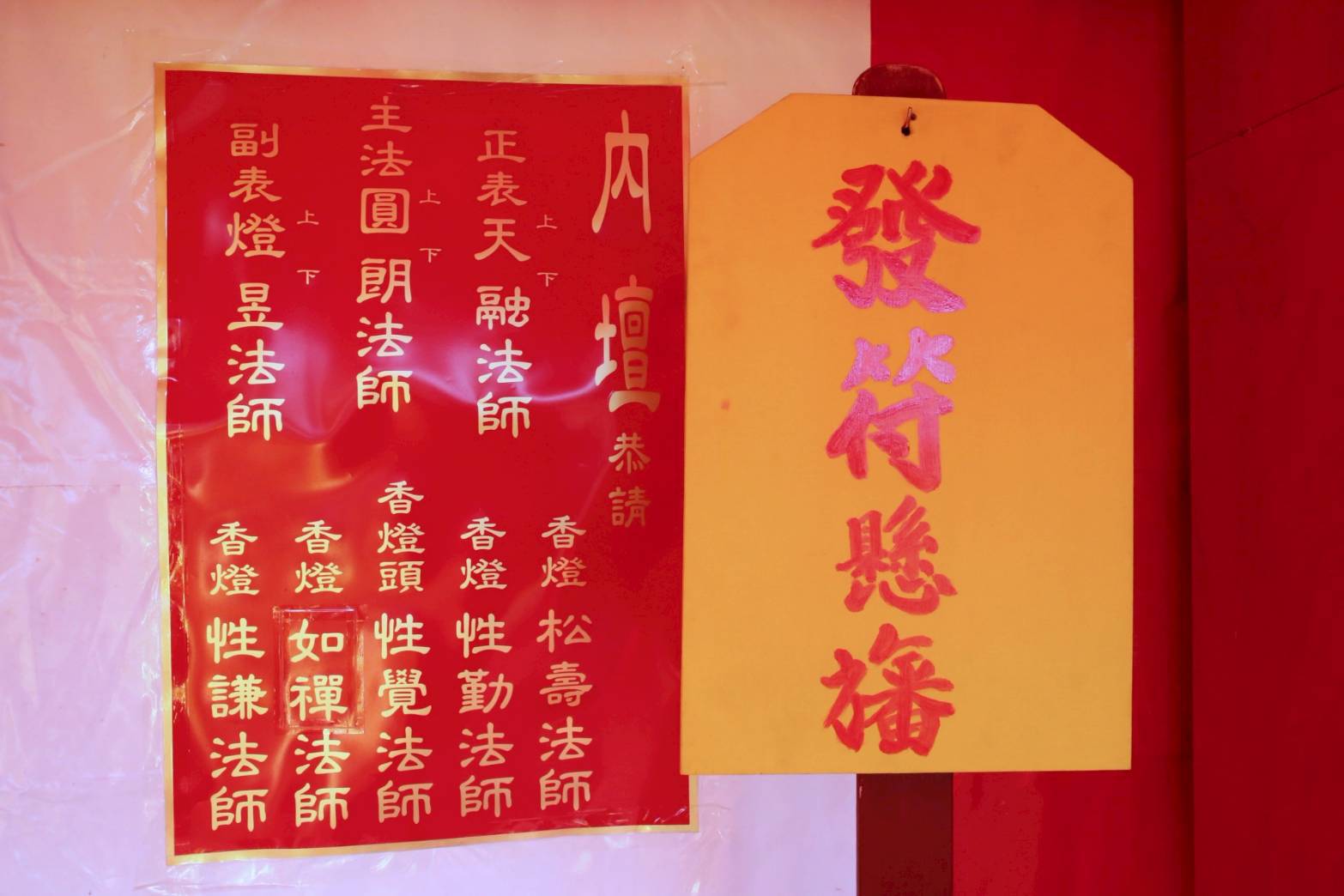 壇內香燈將法師桌椅、科儀、法器及齋主的科儀和拜墊,均向內安置。
