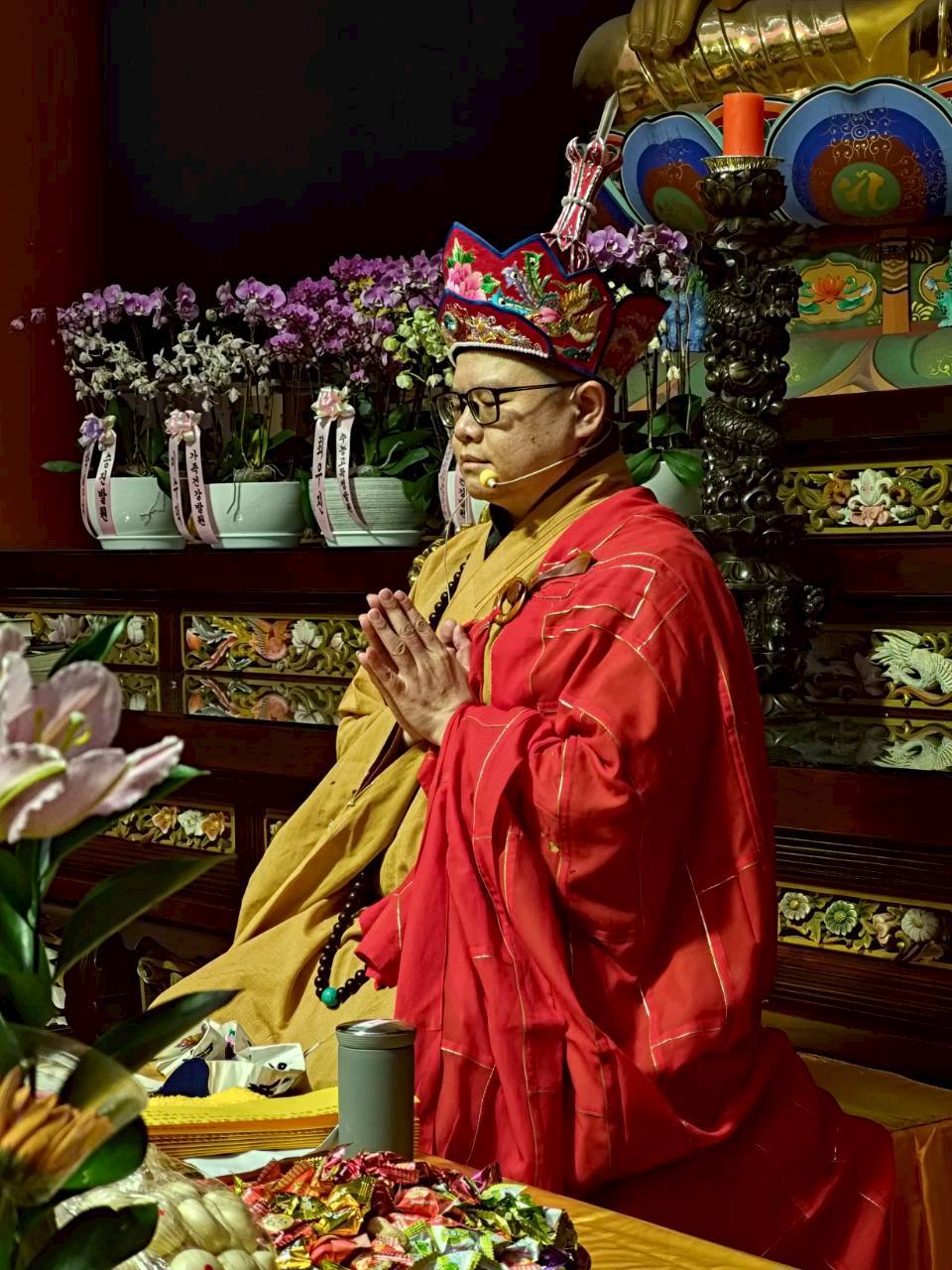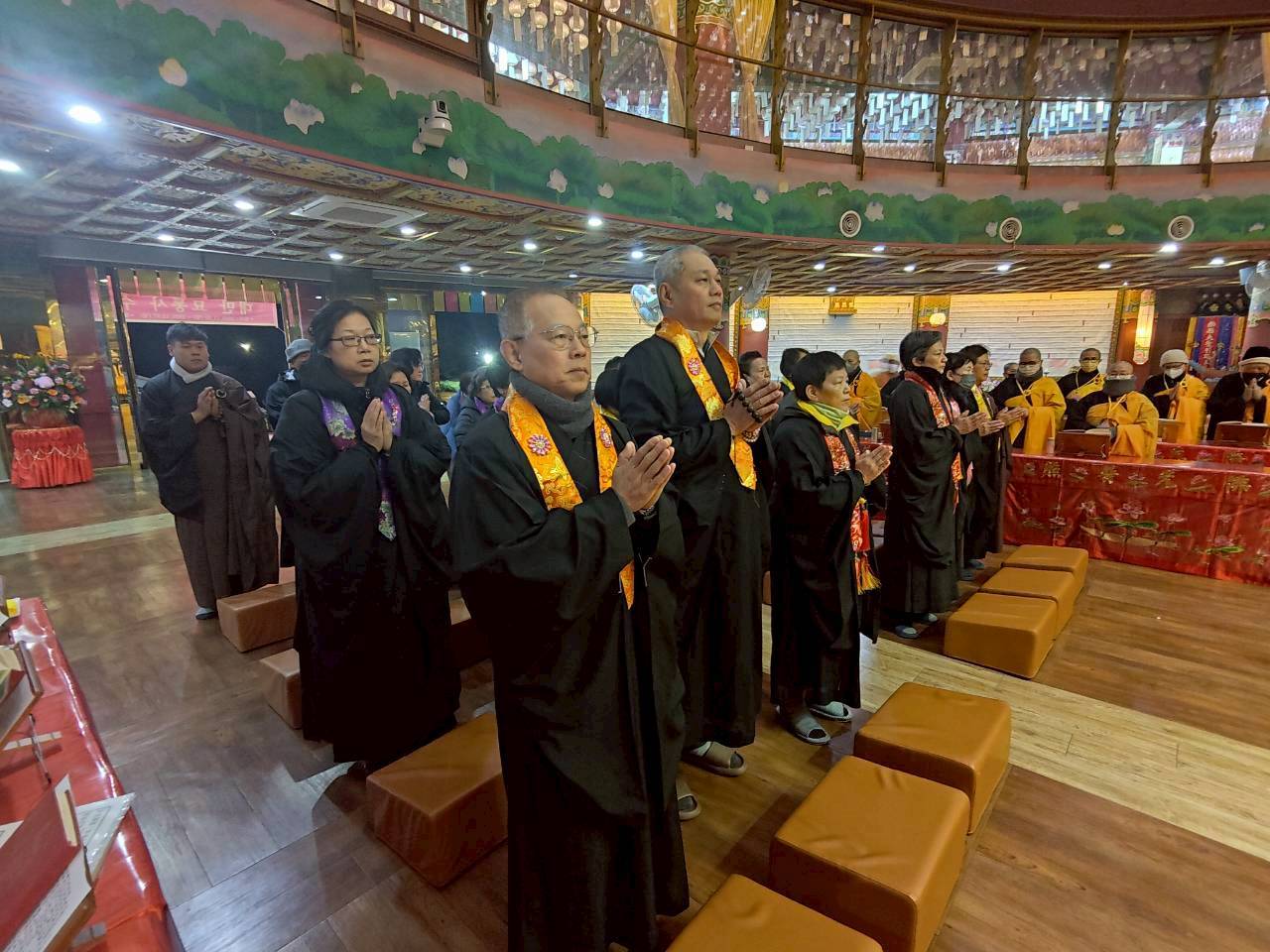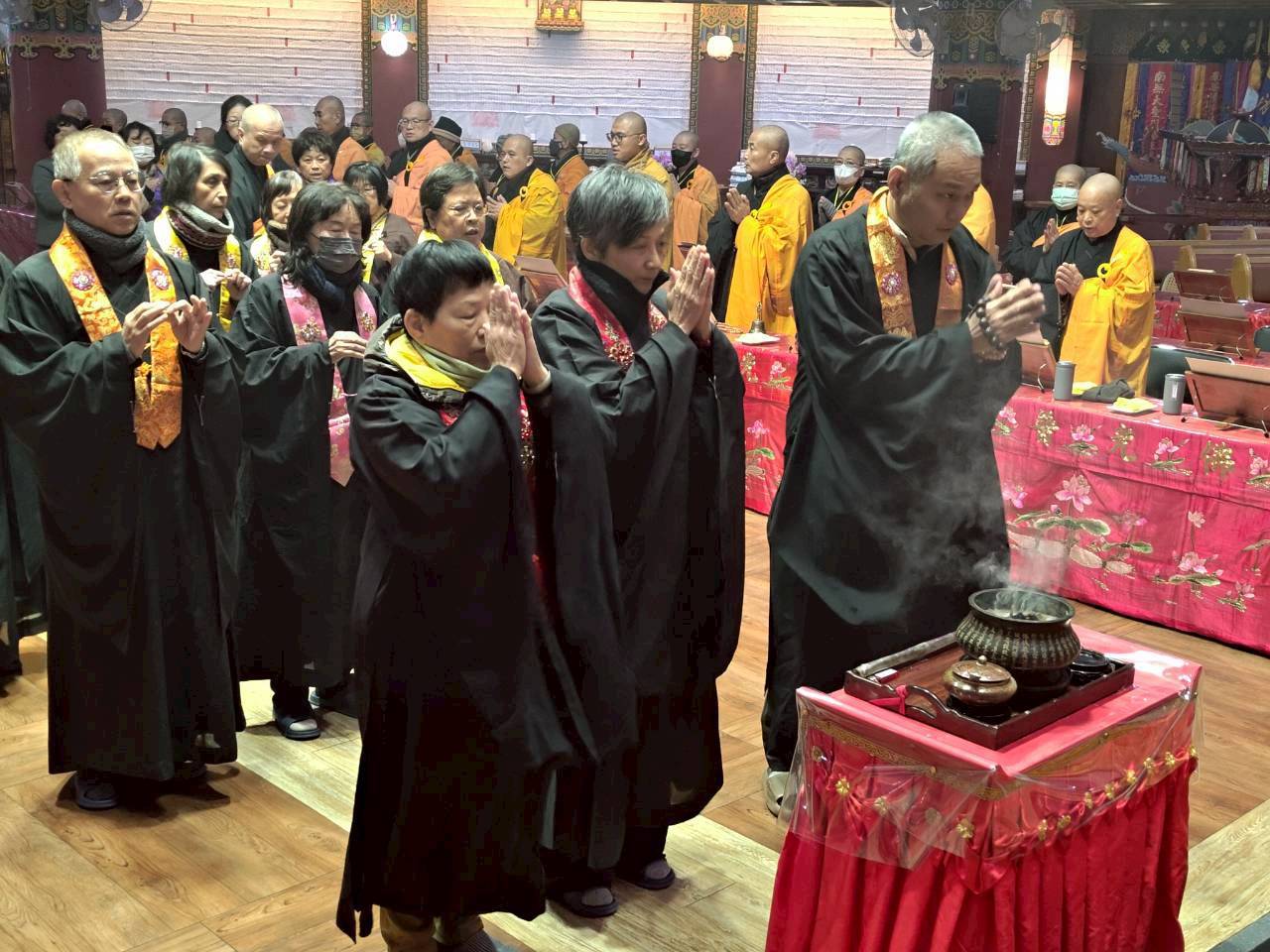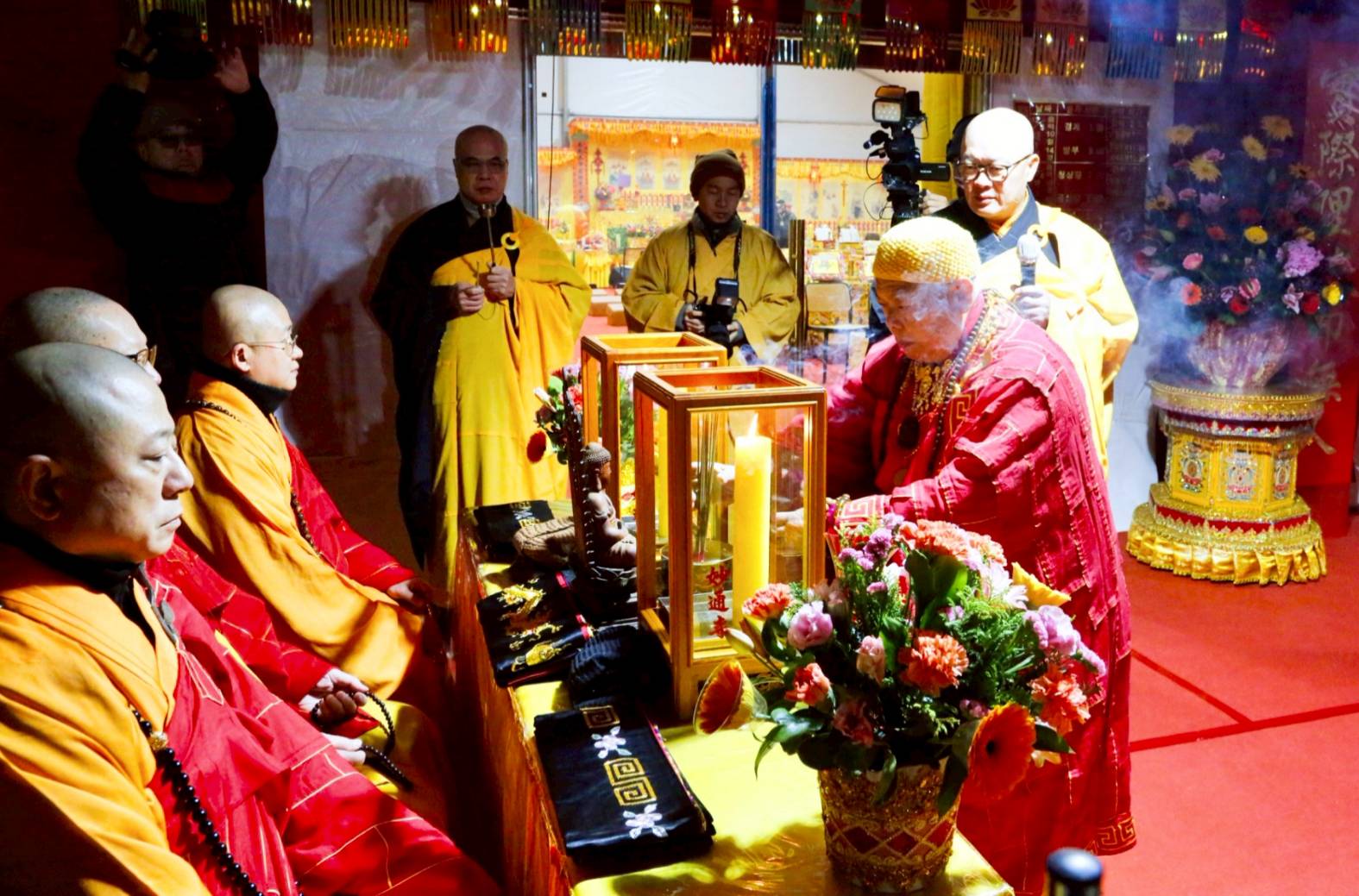 入壇已,三位主法和尚依序禮佛、拈香。上傳下敦師父和齋主依序拈香。