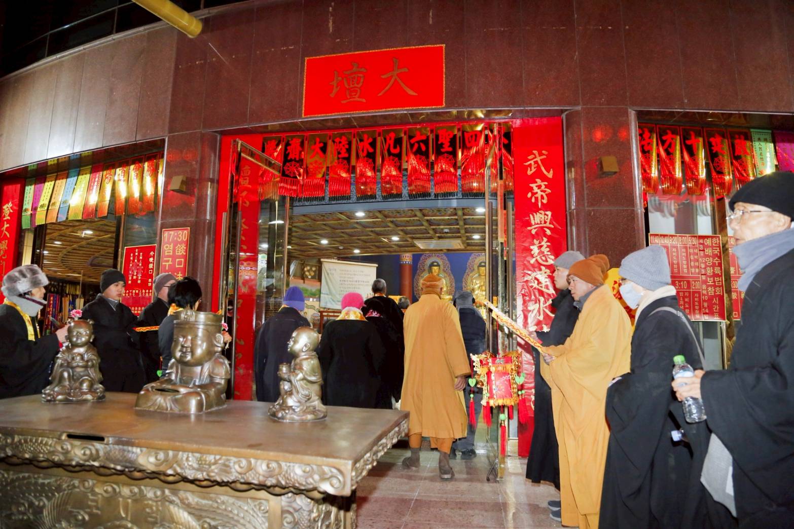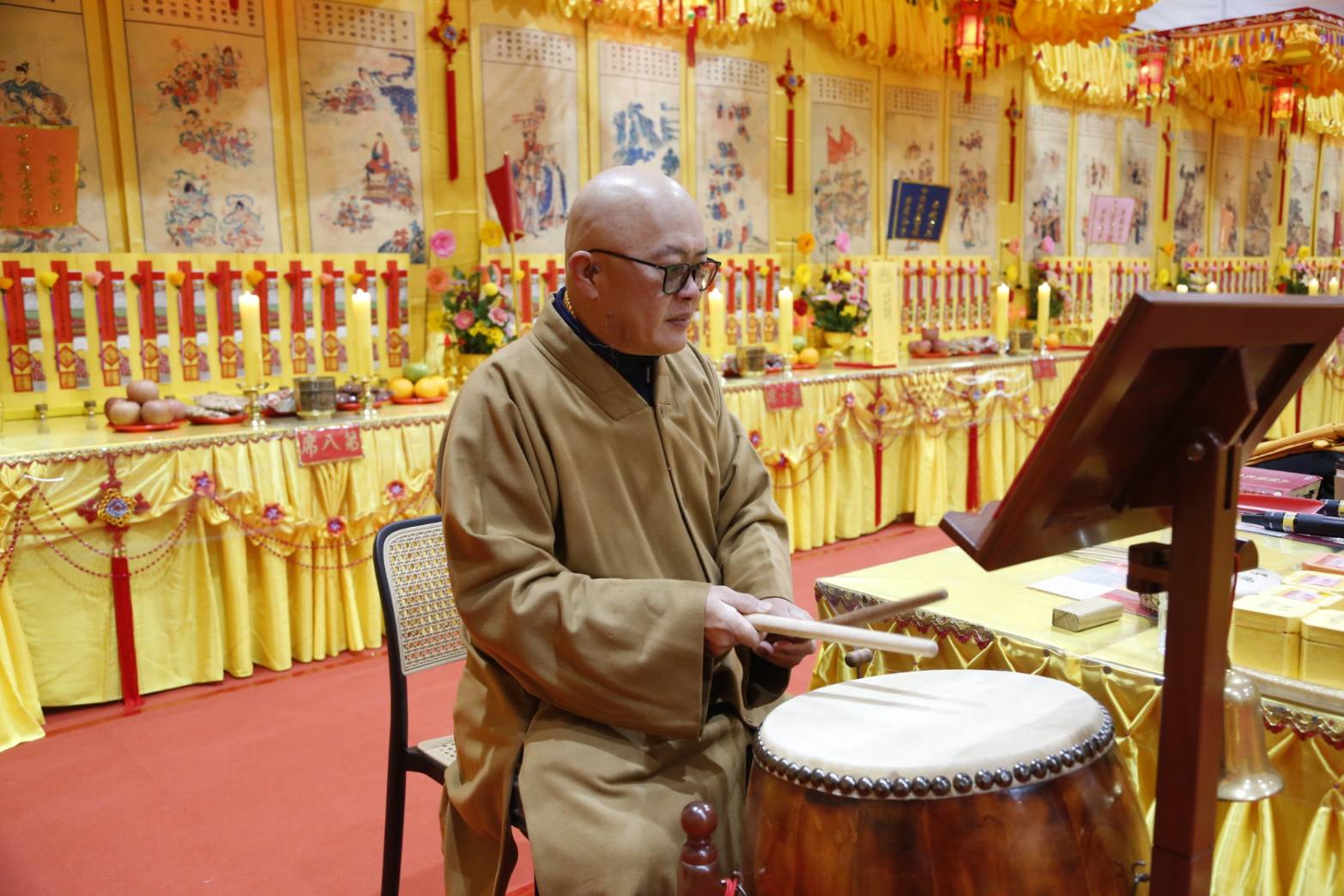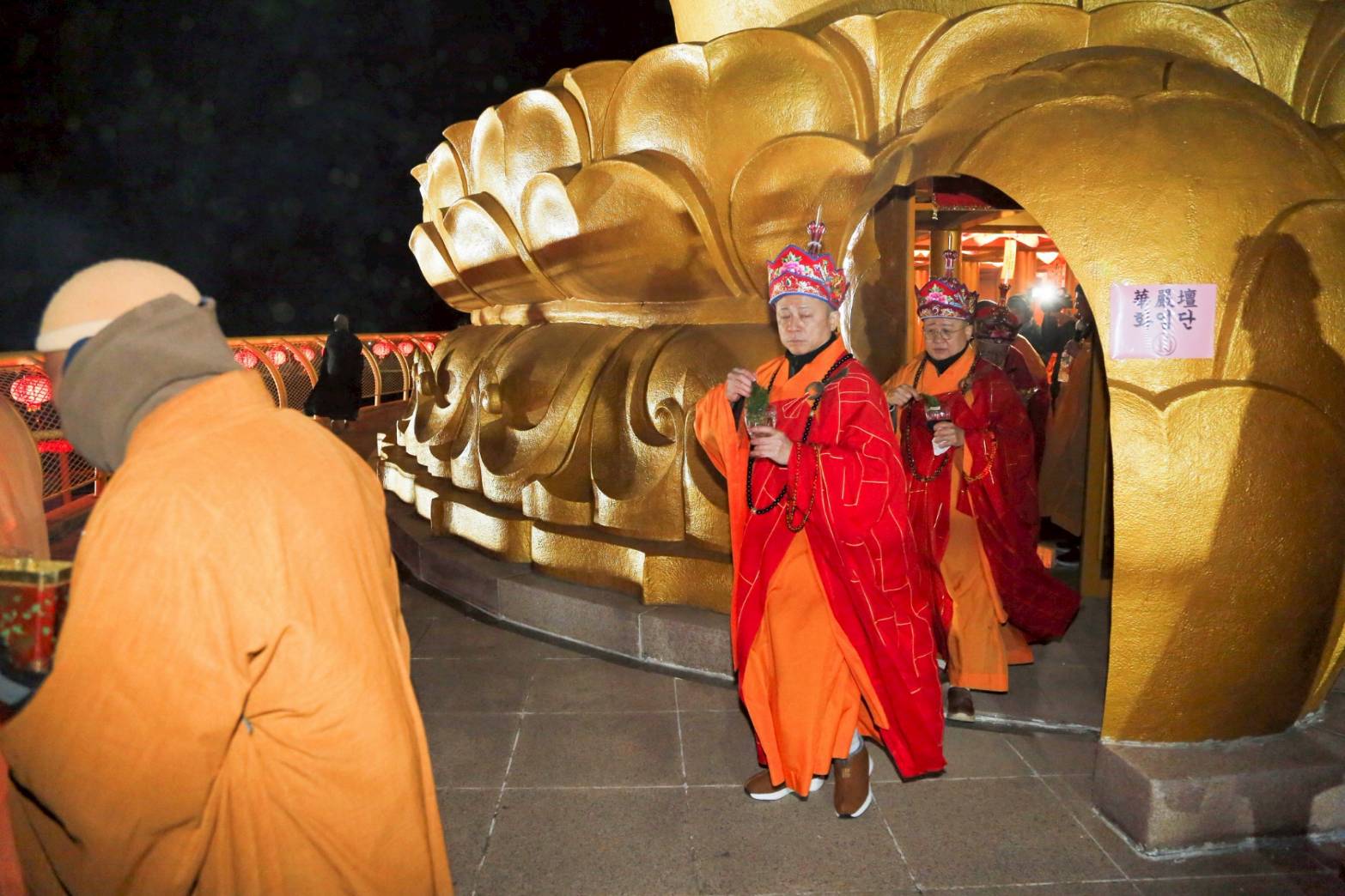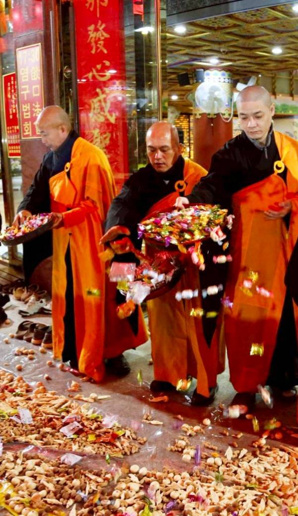 清晨3點,香燈引領上傳下敦師父與齋主前往法堂恭請三位和尚。