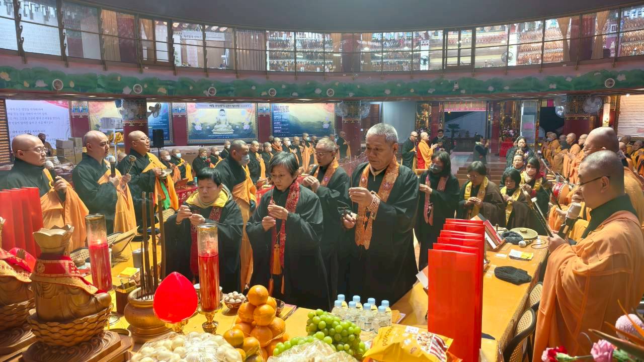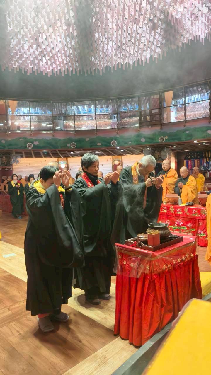 入壇已。三位主法和尚、上傳下敦師父和齋主依序拈香。
