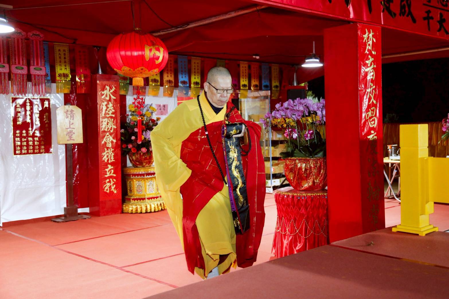 凌晨2點,齋主入壇禮佛三拜,香燈鳴引磬,引領上傳下敦師父、齋主,恭請三位主法和尚。